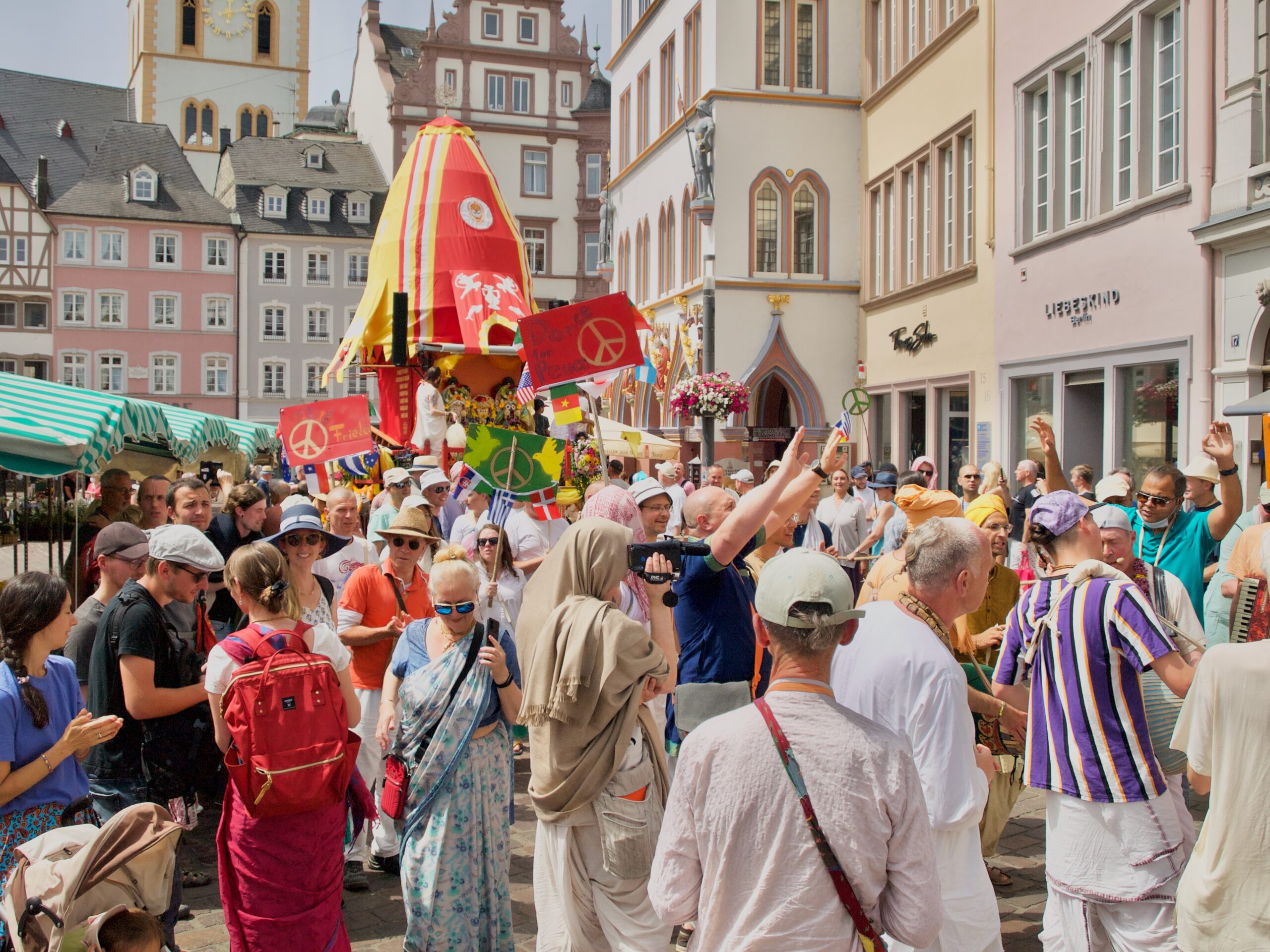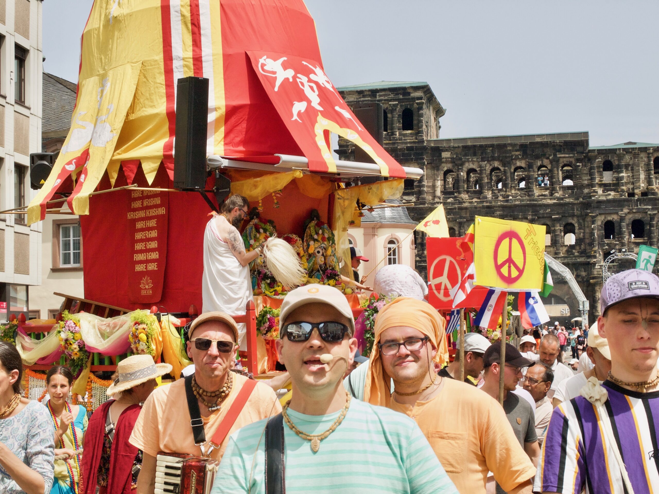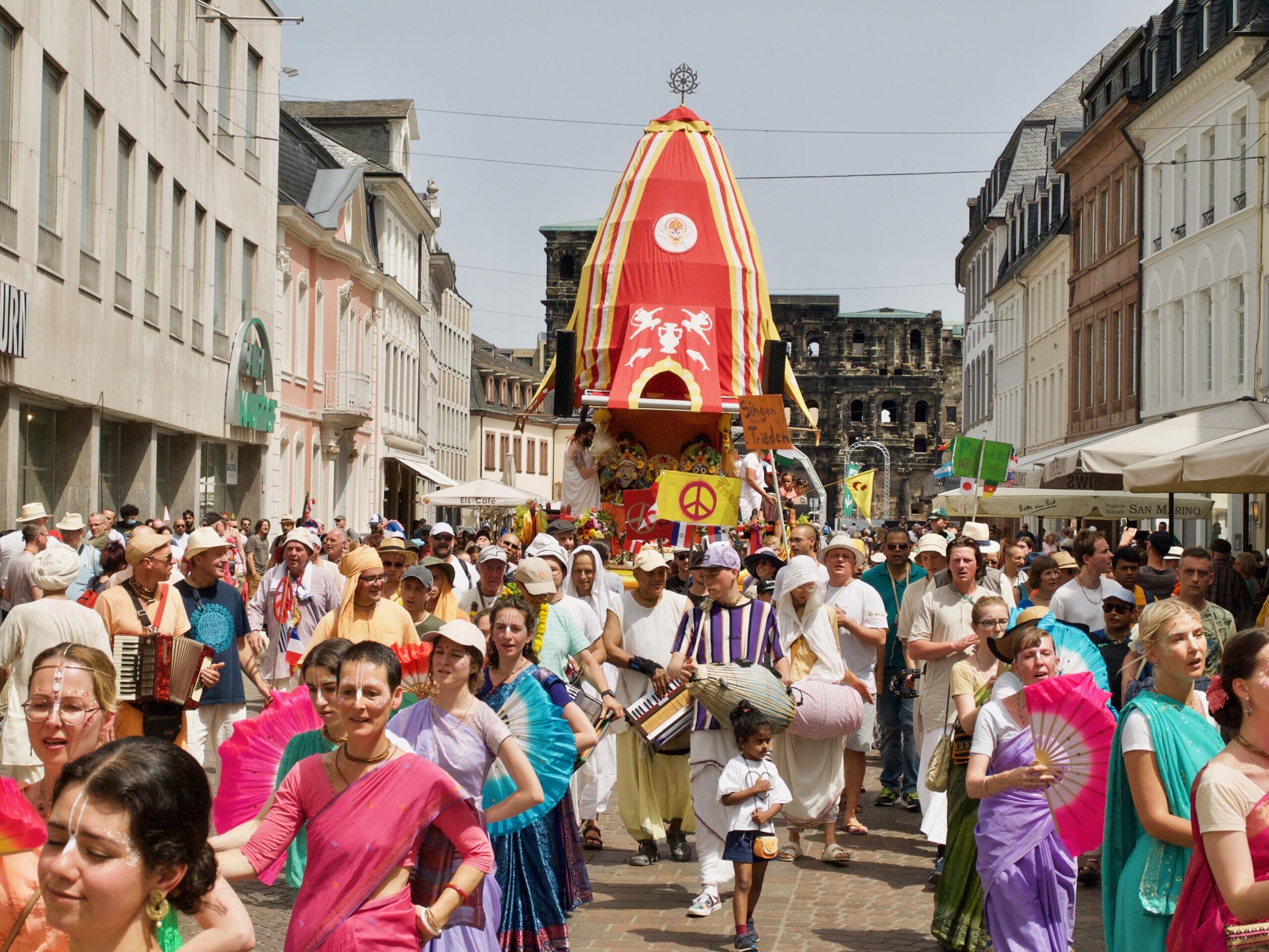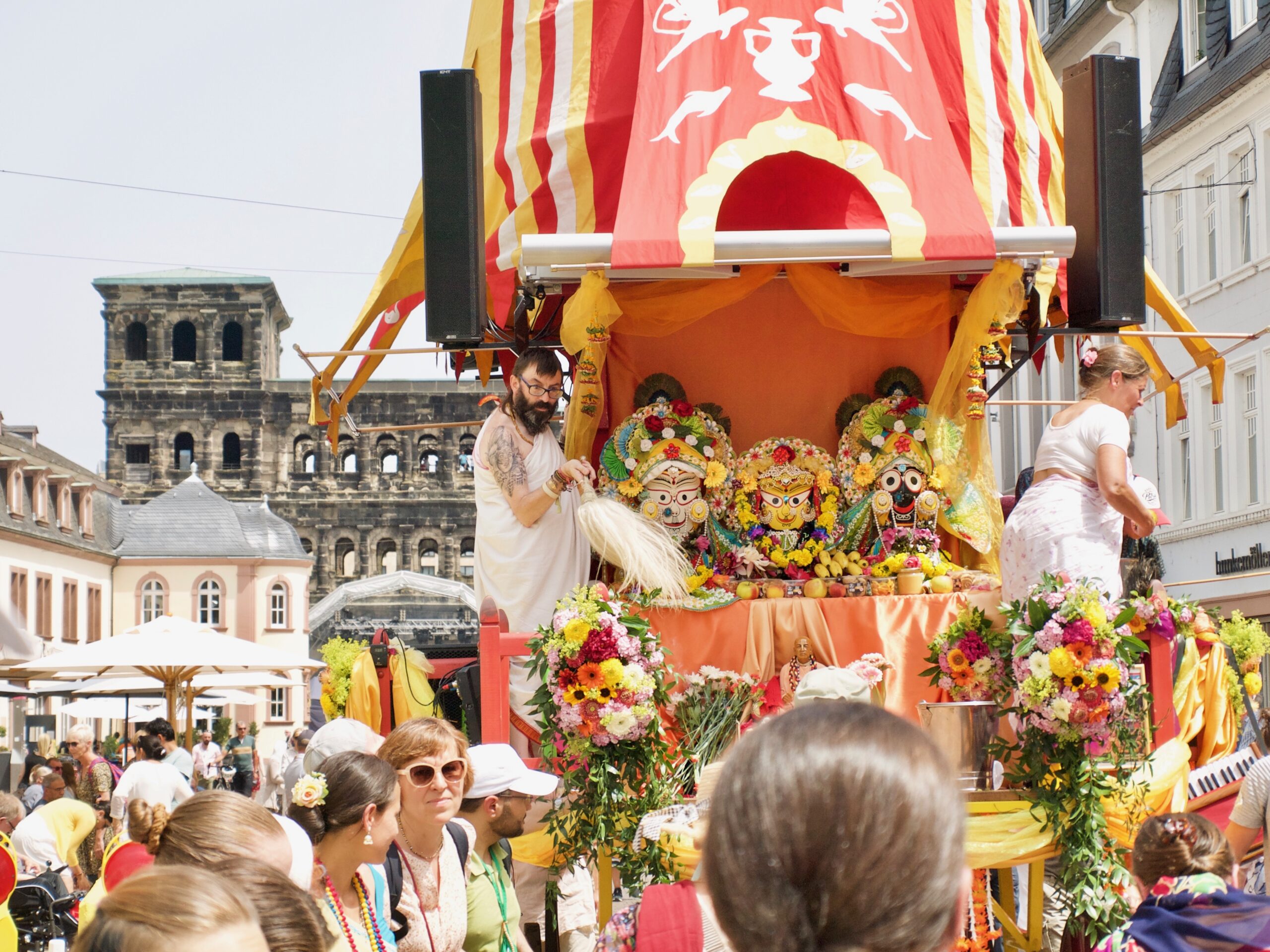 Das erste Ratha-Yatra in Trier fand am 18.06.2022 statt. Organisiert wurde das Ganze von dem Goloka Dhama Tempel in Abentheuer. Die Bildgestalten kamen aus Radhadesh in Belgien. Die Versammlung stand unter dem Motto: “Für Frieden und Völkerverständigung”. Es waren ungefähr 250 Personen anwesend.